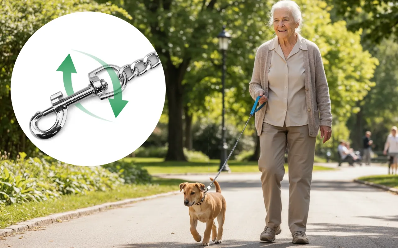 Move freely without knots or twisted lines ever. The clever hook rotates so pets roam safely beside you.