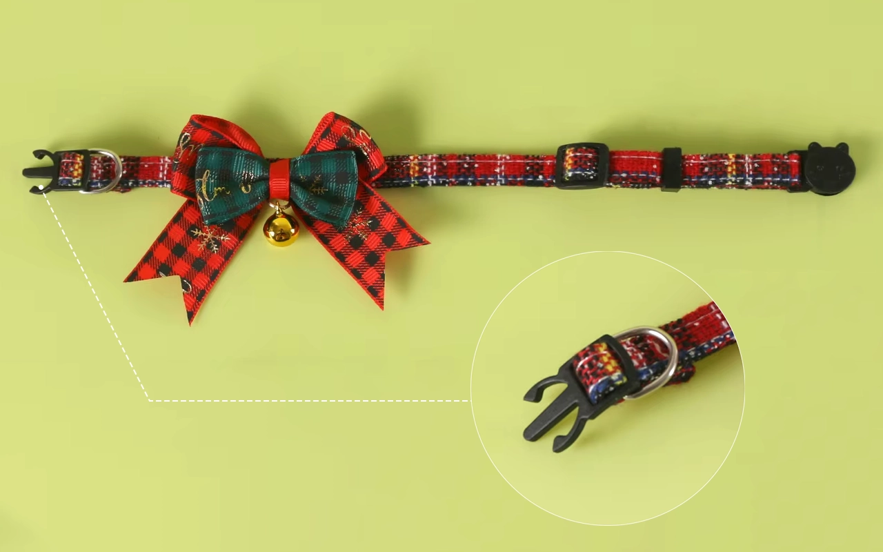The clasp is really gentle and doesn’t bother our kitty at all. Plus, the colors make her stand out in all our holiday photos.