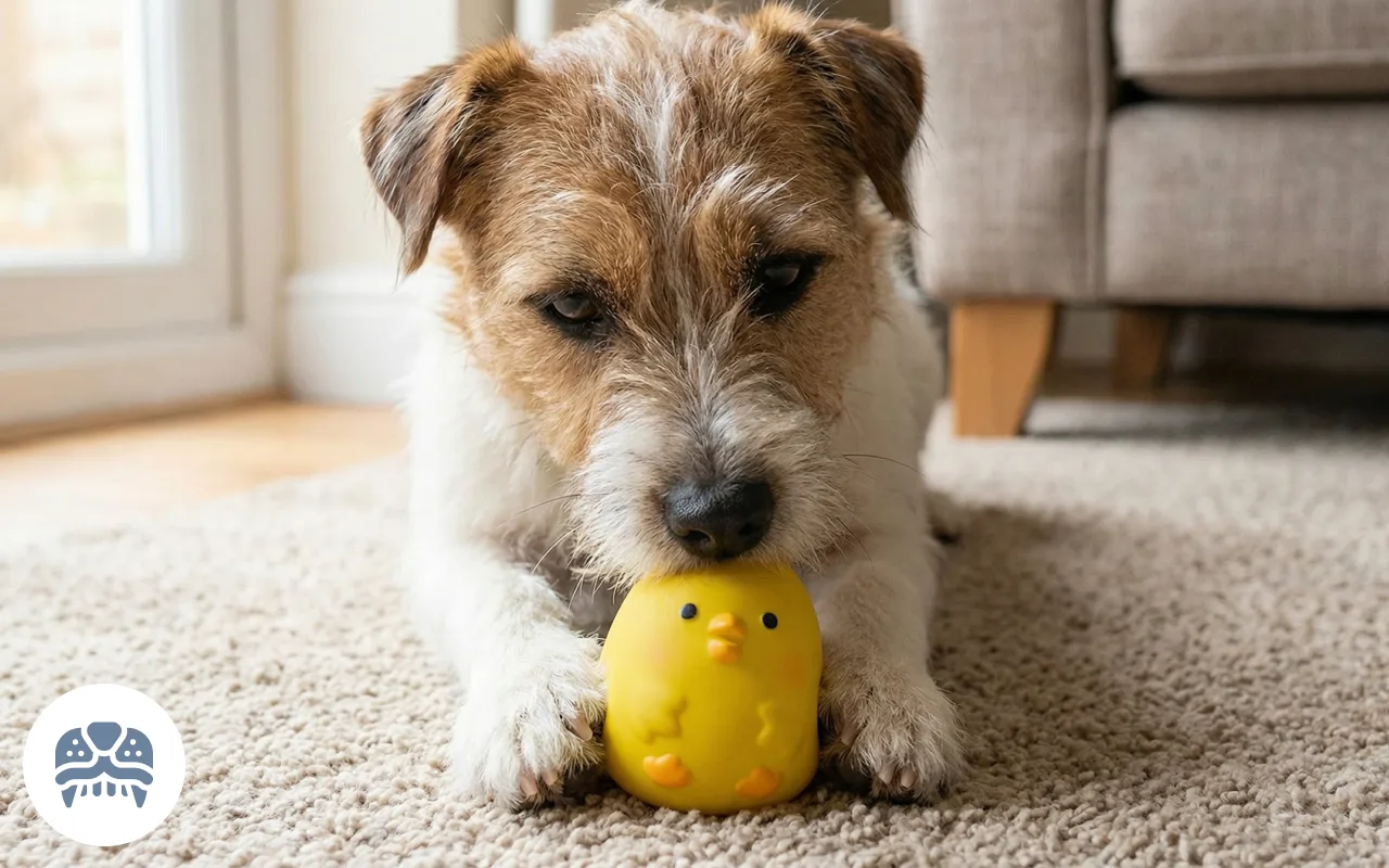 The chicken toy keeps my terrier busy for hours. She loves the silly sound, and the design helps her teeth too. Happy pup, happy me!