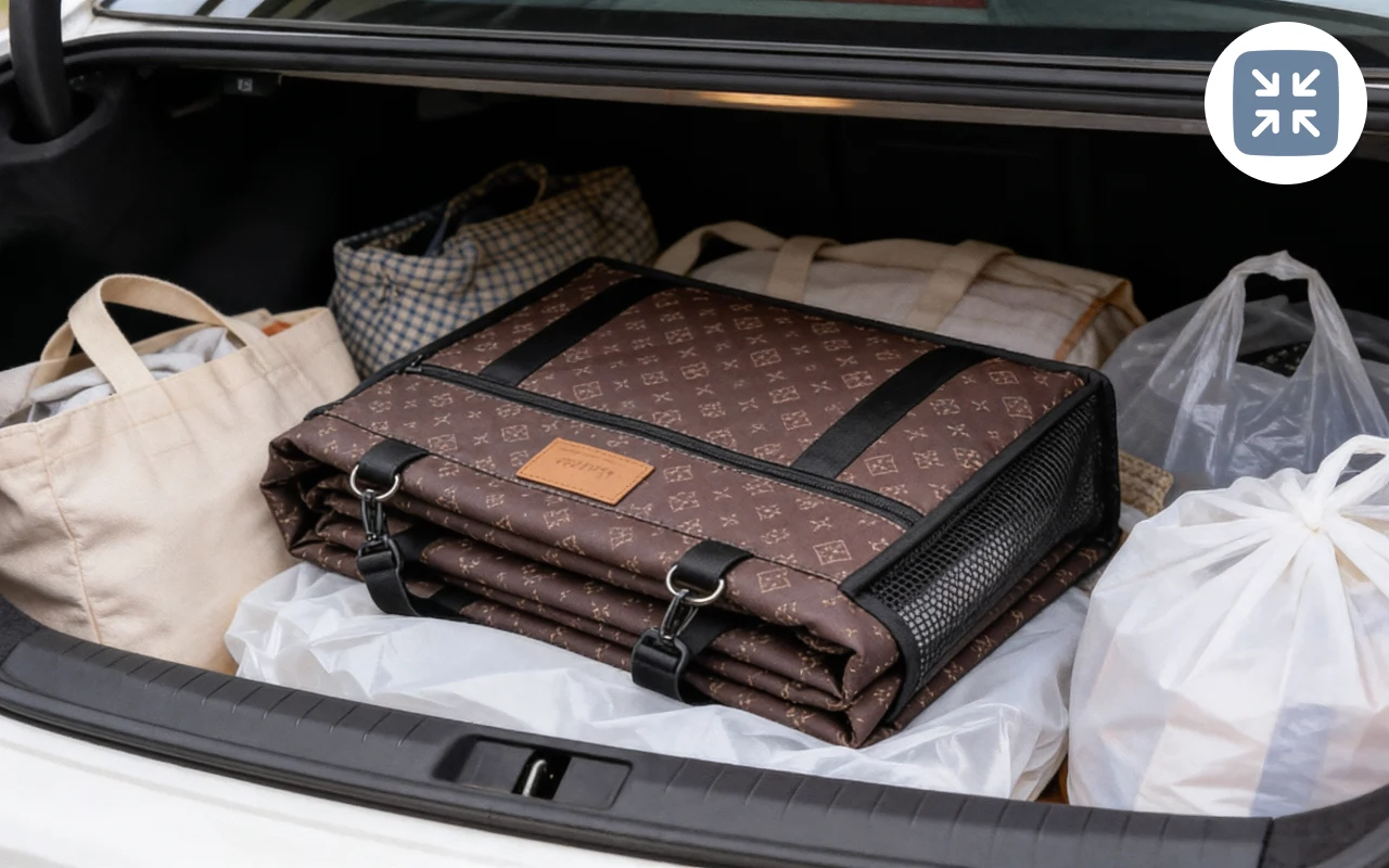 Easy folding design means no hassle when storing between drives. Mesh pockets help organise toys, leads, and treats neatly.
