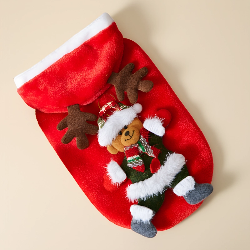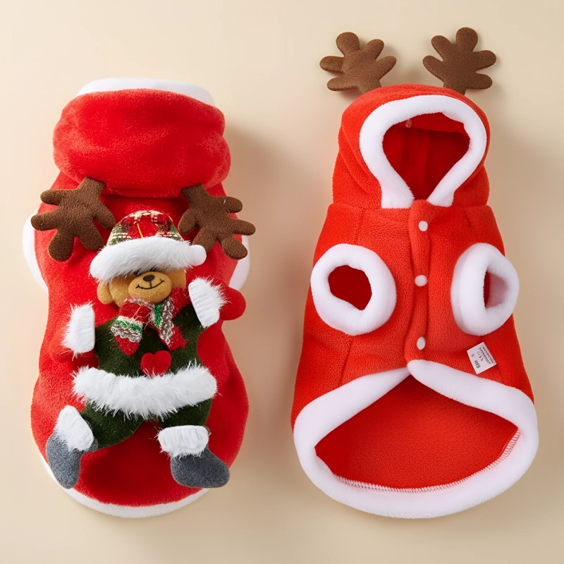 dog reindeer costume, dog red coat, dog christmas costume, dog reindeer outfit, dog cloak with raindeer antlers,