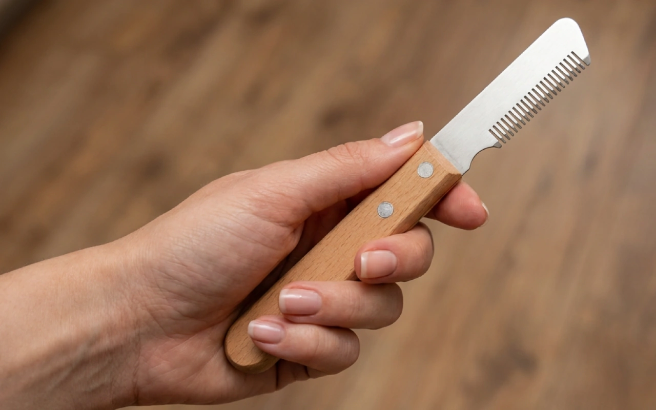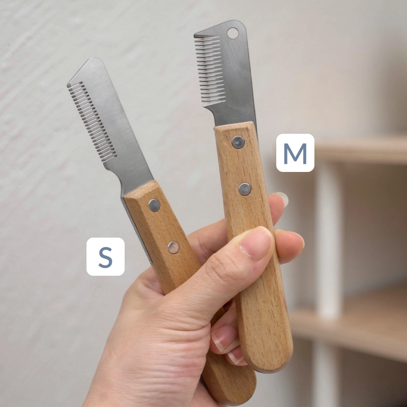 Really happy with this grooming knife. My golden retriever actually sits still and his coat is silky soft afterward. The wood handle feels sturdy and it doesn’t slip when my hand gets wet.