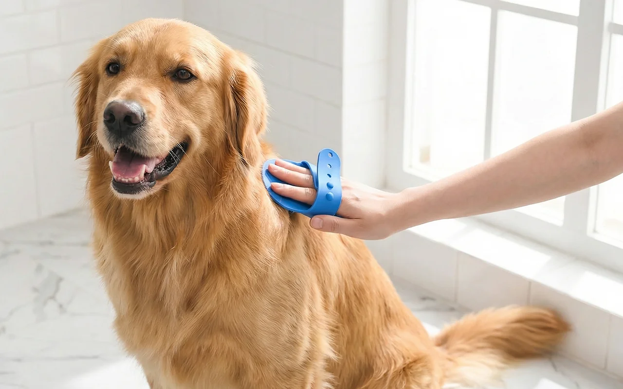 This brush fits my hand well and gets all the messy hair off my golden retriever. Super easy to use and feels like a massage for him.