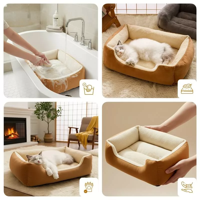 My cat loves curling up in her new bed. The raised edges help her feel safe, and cleaning it is easy for me. It looks cute in our living room too!