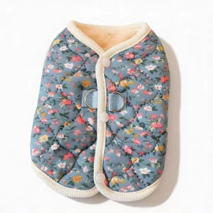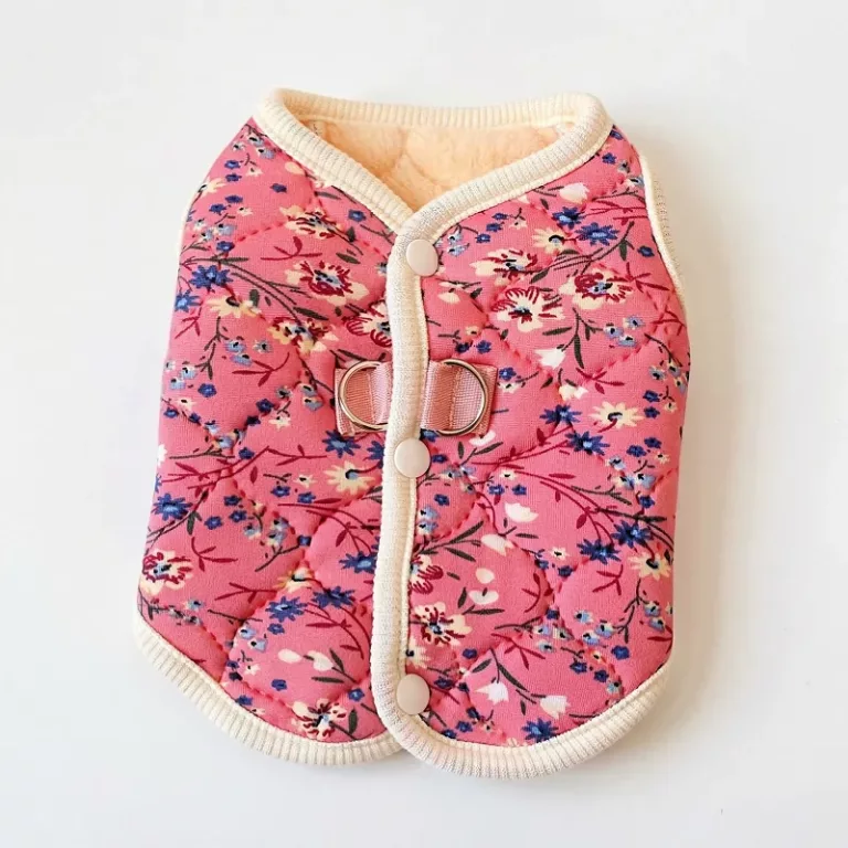 This cozy jacket keeps my dog warm and he looks adorable in the flower design. Putting it on takes just a second. Love it for walks!