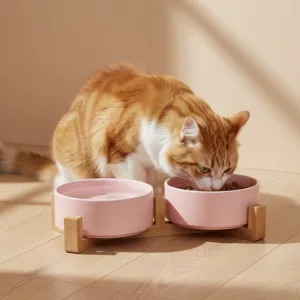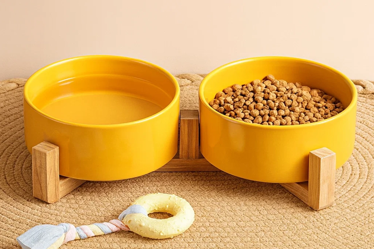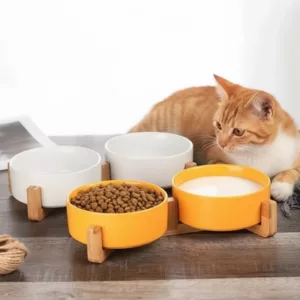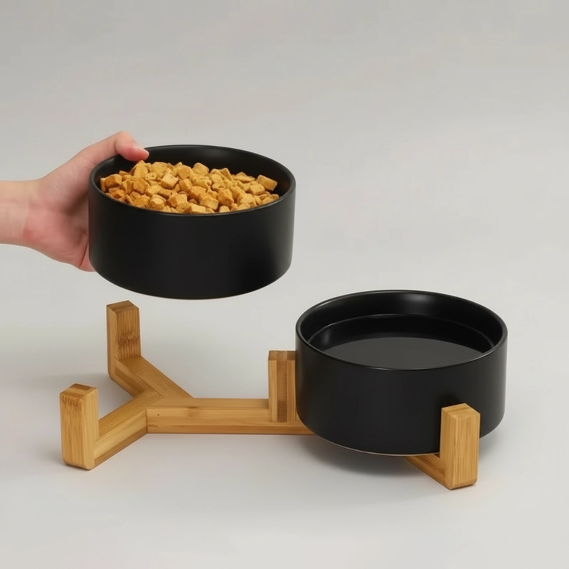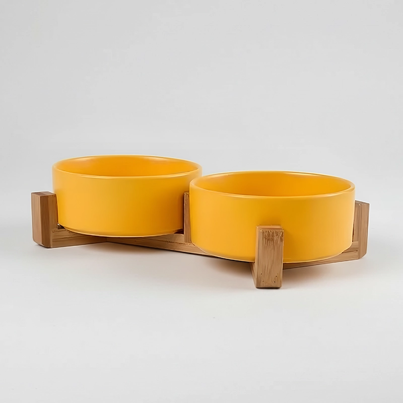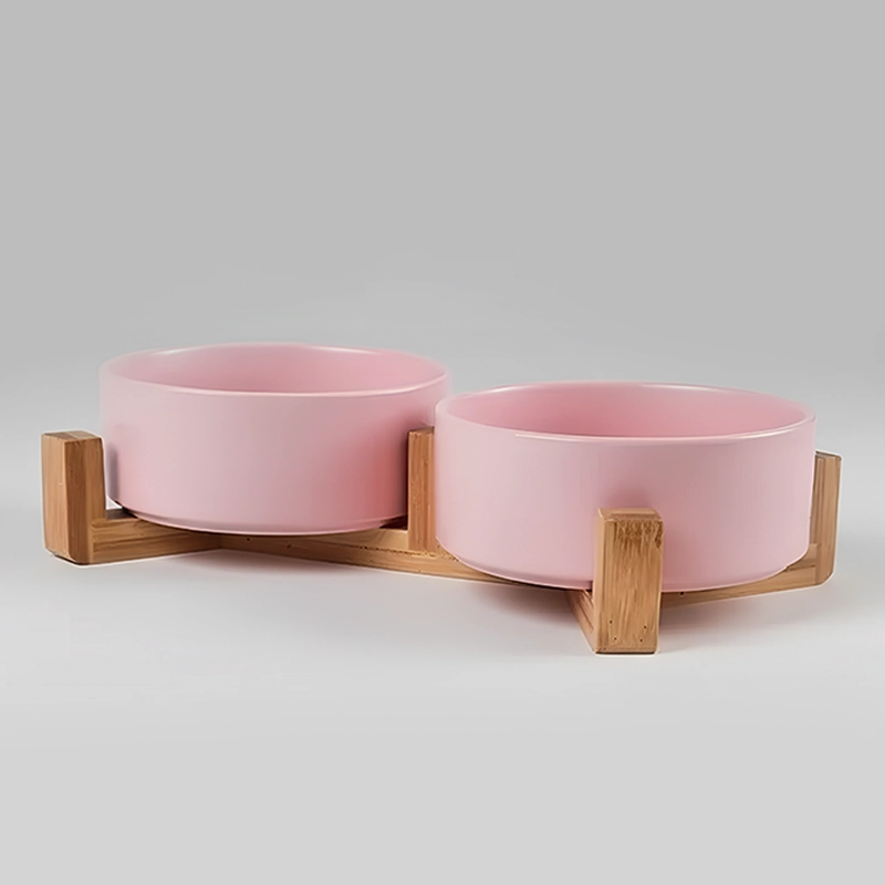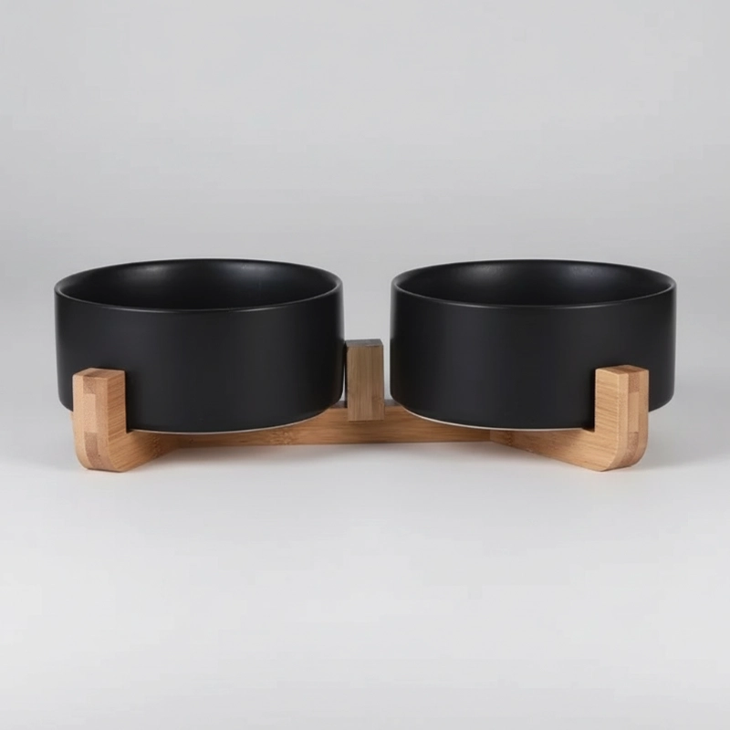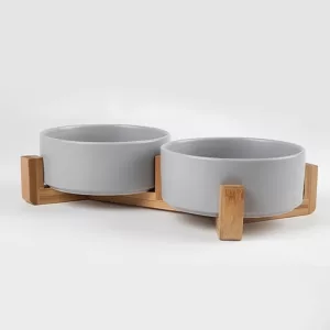 Two-In-One Ceramic Pet Bowl with Wooden Stand