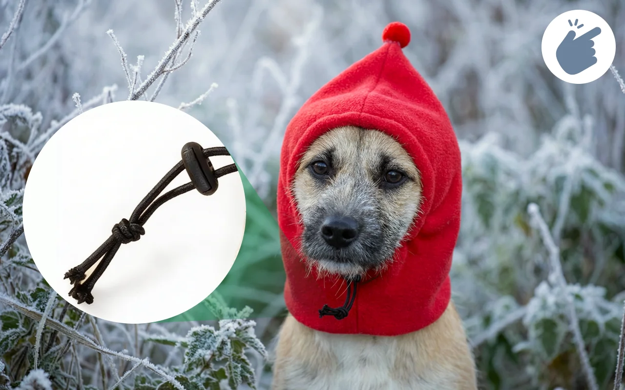 Absolutely love the drawstring design! It keeps the hat secure and my dog doesn’t mind wearing it at all. Super soft fleece.